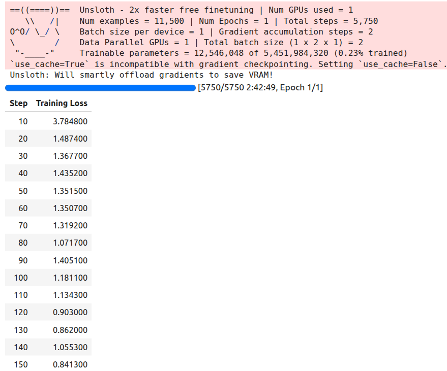 We have kept the batch size as 1 and gradient accumulation step as 2. You can increase the batch size if your GPU has more VRAM. We will be training for 1 epoch.