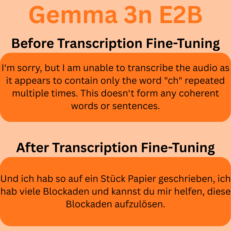 We will cover the following while fine-tuning Gemma 3n for German speech transcription: