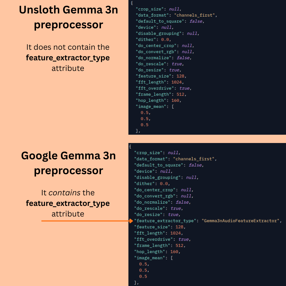 However, before that, we need to address one major issue. The processor configuration (preprocessor_config.json) from Unsloth does not contain the "feature_extractor_type" attribute that is necessary to load the processor correctly. The following image shows a comparison between the configuration file between the official Google config file and the Unsloth config file.