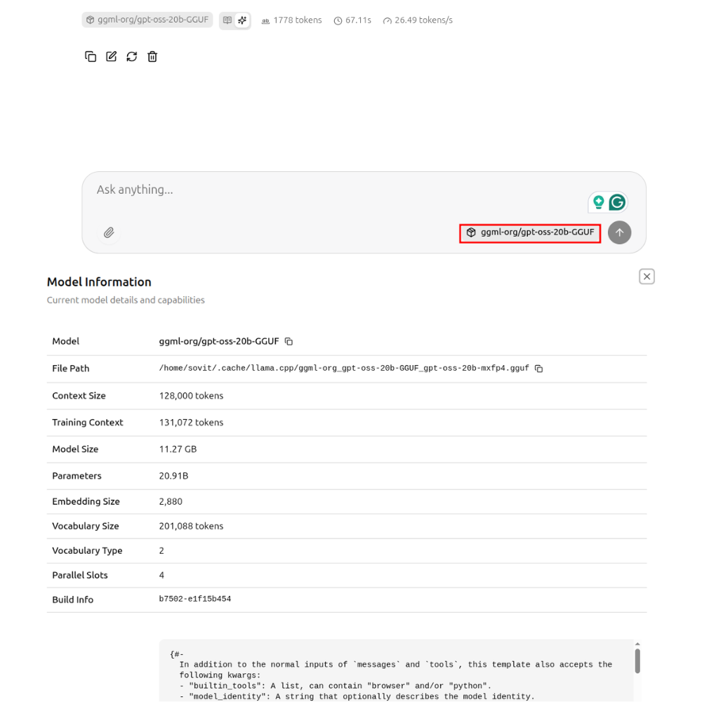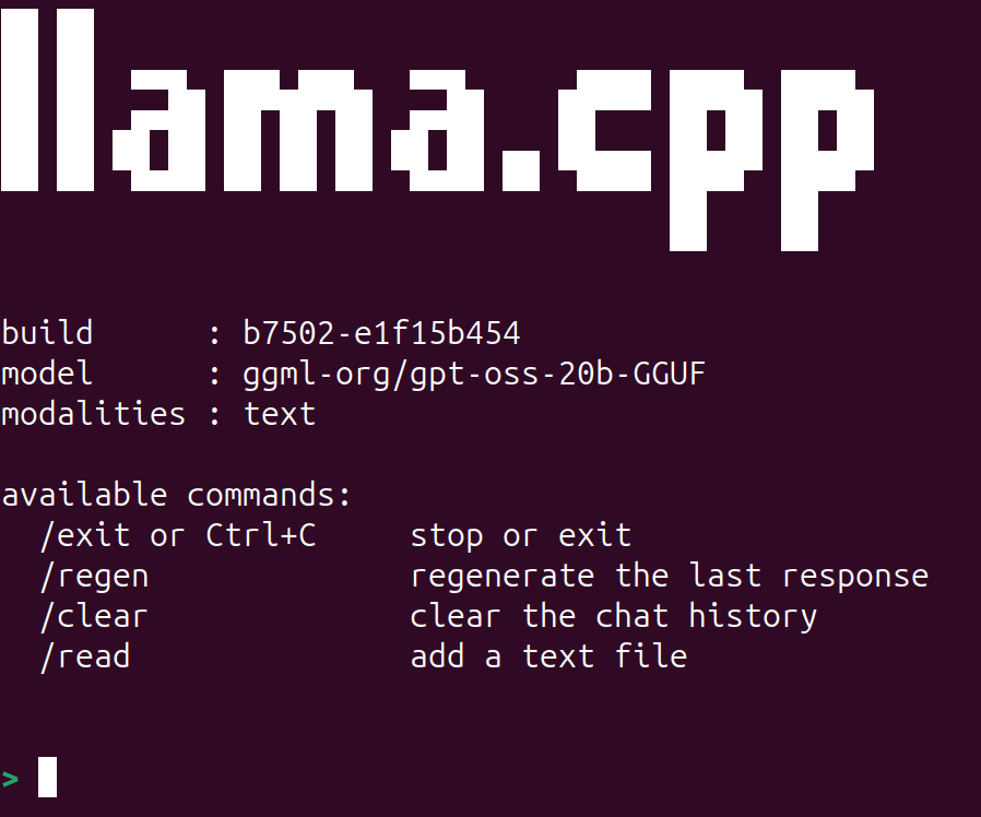 Although we can run any model, we will focus on gpt-oss-20b here. Execute the following command within the cloned llama.cpp directory.