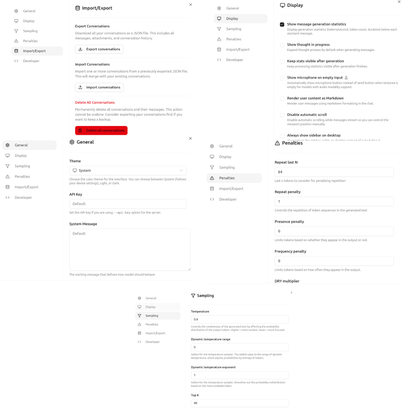 Furthermore, clicking on the settings icon at the top exposes several model and UI settings, such as general, display, sampling, and penalty.