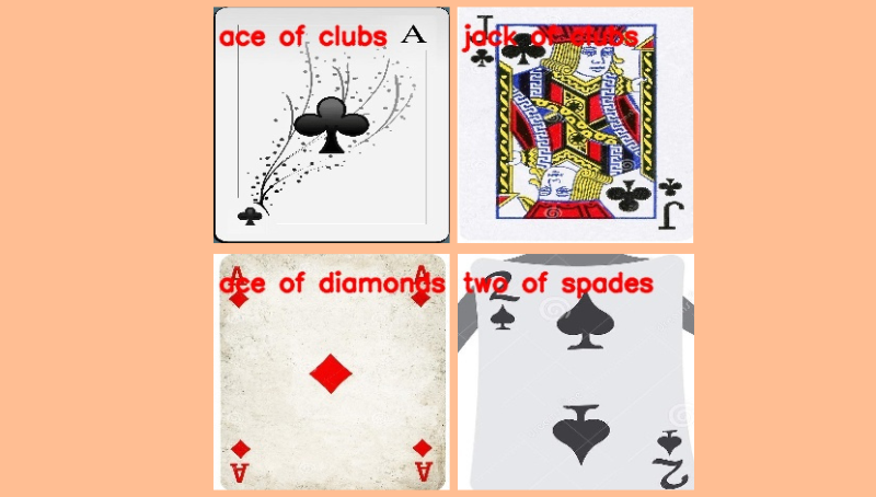 CLASS_NAMES: ['ace of clubs', 'ace of diamonds', 'ace of hearts', 'ace of spades', 'eight of clubs', 'eight of diamonds', 'eight of hearts', 'eight of spades', 'five of clubs', 'five of diamonds', 'five of hearts', 'five of spades', 'four of clubs', 'four of diamonds', 'four of hearts', 'four of spades', 'jack of clubs', 'jack of diamonds', 'jack of hearts', 'jack of spades', 'joker', 'king of clubs', 'king of diamonds', 'king of hearts', 'king of spades', 'nine of clubs', 'nine of diamonds', 'nine of hearts', 'nine of spades', 'queen of clubs', 'queen of diamonds', 'queen of hearts', 'queen of spades', 'seven of clubs', 'seven of diamonds', 'seven of hearts', 'seven of spades', 'six of clubs', 'six of diamonds', 'six of hearts', 'six of spades', 'ten of clubs', 'ten of diamonds', 'ten of hearts', 'ten of spades', 'three of clubs', 'three of diamonds', 'three of hearts', 'three of spades', 'two of clubs', 'two of diamonds', 'two of hearts', 'two of spades']