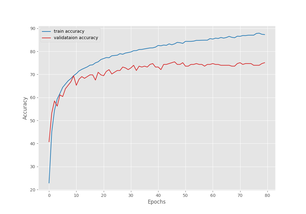 As we can see, our Linear Classifier head contributed to just 20,405 trainable parameters. This is great for resource constrained and faster training. However, even after 80 epochs, we have the best validation accuracy of only around 74%. Here are the graphs.