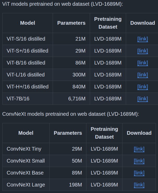 DINOv3 is available in 4 ConvNext and 6 Vision Transformer pretrained versions in their corresponding sizes.
