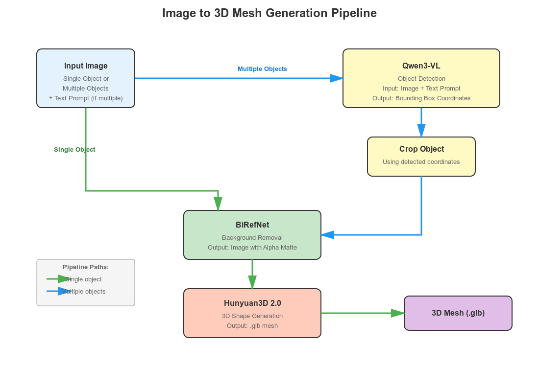 - If the uploaded image contains multiple objects, the user can type the name of the object in a text box that needs to be converted into a 3D mesh. The image, along with the prompt, goes into the Qwen3-VL model for object detection. We get the coordinates of the object, crop it, pass it to BiRefNet for background removal, and finally feed it to Hunyuan3D 2.0.