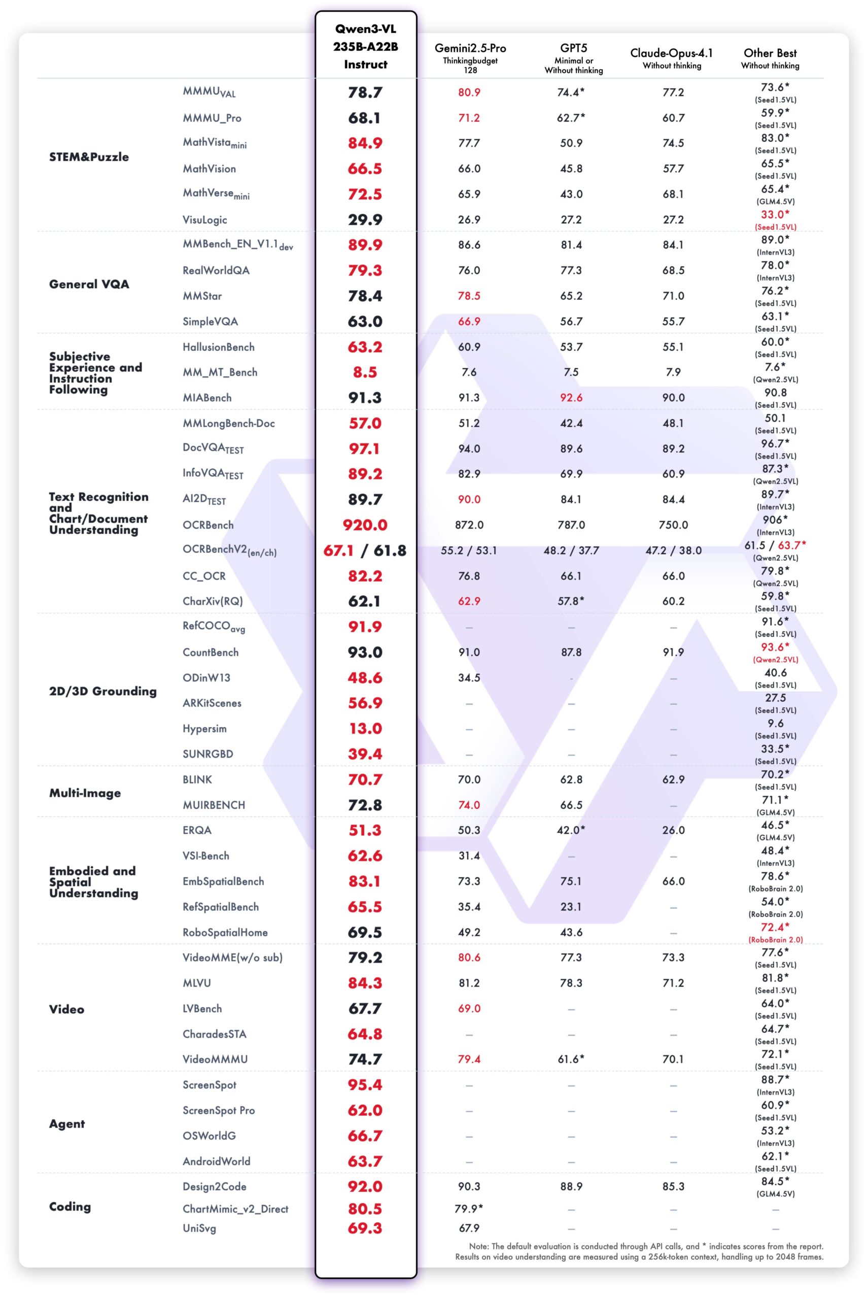 All models natively support a 256K token context, which can be expanded up to 1 million tokens. This allows the model to process hundreds of pages of documents or even videos up to two hours long. In “needle-in-a-haystack” experiments on long videos, the model achieved 100% accuracy with a 256K context length and 99.5% accuracy at 1M tokens, demonstrating incredibly strong long-sequence modeling.