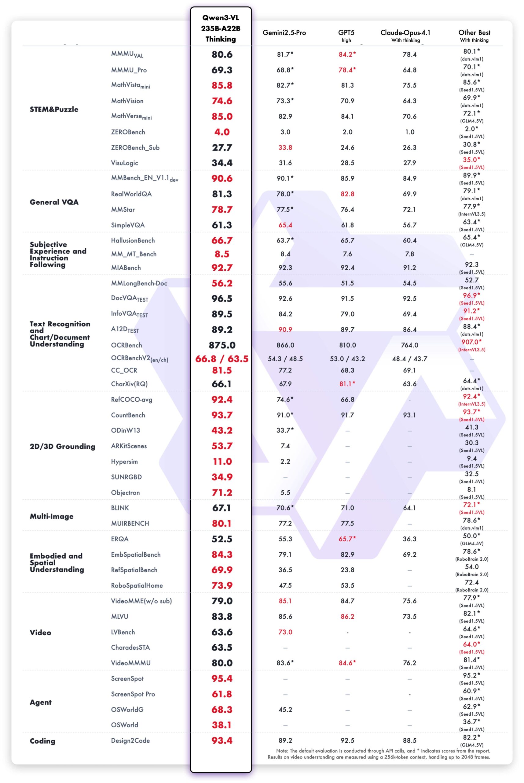 The Qwen3-VL-235B-A22B-Thinking model, optimized for reasoning, also establishes new state-of-the-art results among open-source models. It shows a competitive edge against closed-source models, particularly in complex multimodal math problems where it outperforms Gemini 2.5 Pro.