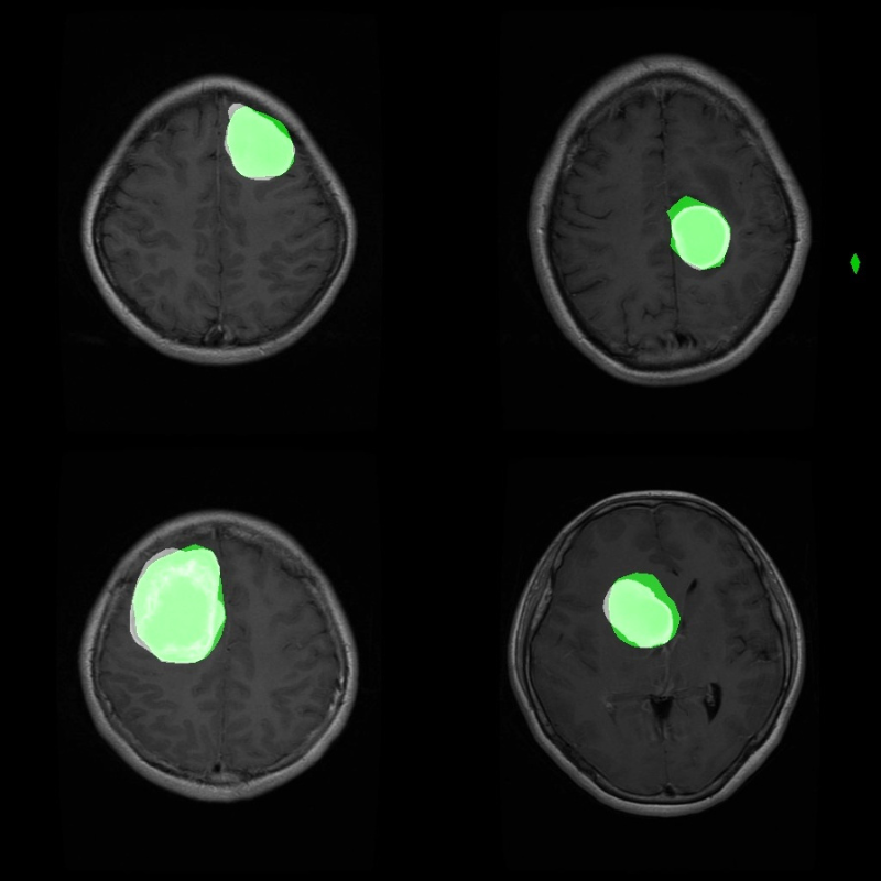 First, let’s analyze some results where the model seems to be performing well. The segmented region in green is the model inference, and white is the ground truth.