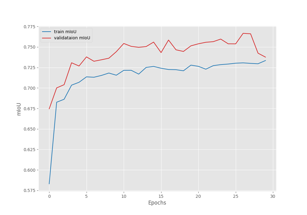 We get the best validation IoU of 76.66% on epoch 27. This is the model we will use for inference.