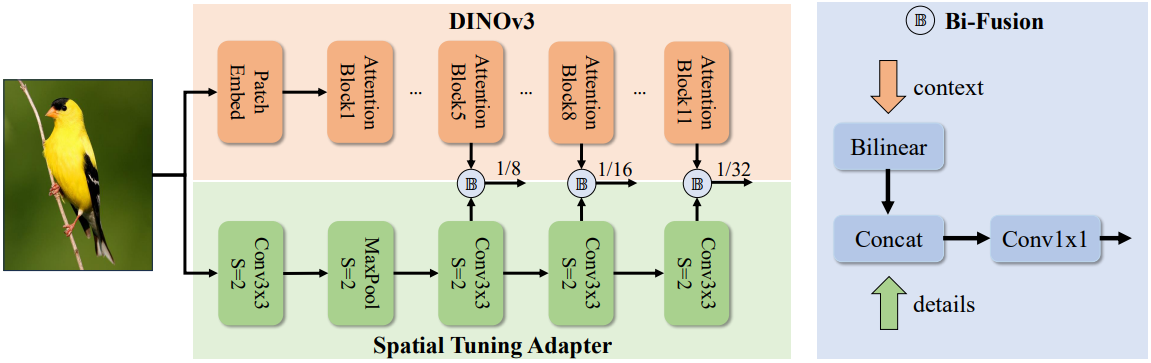 - Parallel Processing: The STA is a lightweight convolutional neural network (CNN) that runs in parallel with the main DINOv3 backbone. While DINOv3 excels at capturing rich, global semantic context (understanding what is in the image), the STA focuses on extracting fine-grained, multi-scale spatial details (understanding where things are with precision).