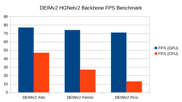After running the experiments, we have the following FPS benchmarks on both CPU and GPU for the HGNetv2 Backbone DEIMv2 models.