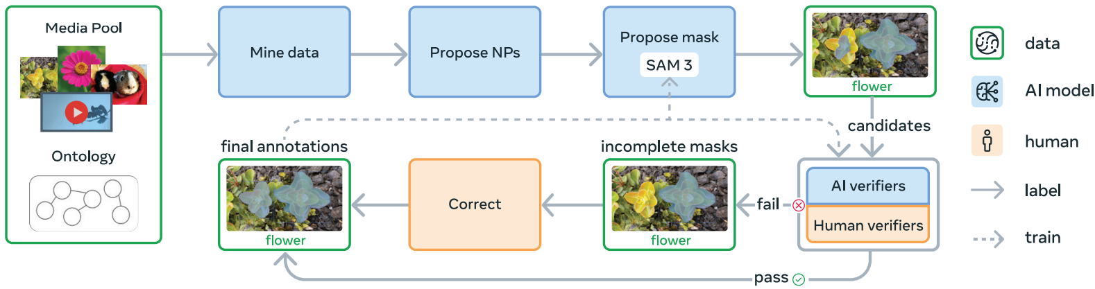 The accepted/rejected labels from humans from step 1 are used to train an AI verifier. Essentially, the SAM 3 team trained a Llama 3.2 model here.