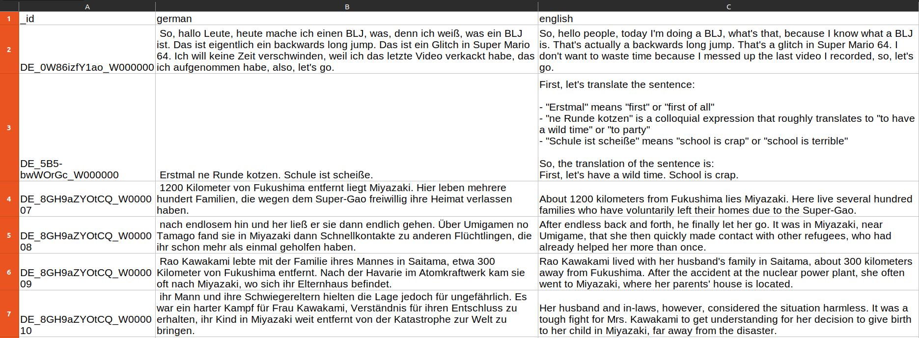 german_to_english_translate.ipynbJupyter Notebook, we have the code to create the translation dataset. The final translation samples are present in thegerman_to_english.csvfile. - The
